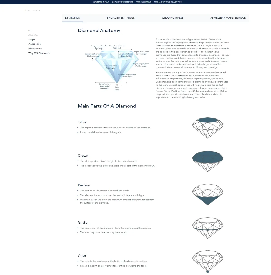 Informative education pages offer valuable content on topics like diamond 4Cs, jewelry care, and customization options, helping customers make informed decisions and enhancing their shopping experience.